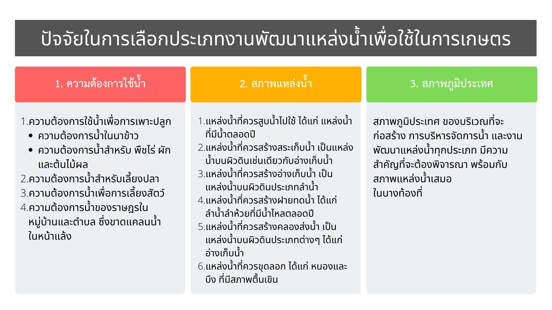 ในการเลือกประเภทงานพัฒนาแหล่งน้ำเพื่อใช้ในการเกษตร ต้องมีการศึกษาวิจัยการบริหารจัดการน้ำและข้อมูลเกี่ยวกับความต้องการใช้น้ำ ศึกษาสภาพแหล่งน้ำธรรมชาติ และตรวจสอบภูมิประเทศ ในบริเวณที่จะก่อสร้างงานพัฒนาแหล่งน้ำให้ถูกต้อง ตามหลักการบริหารจัดการน้ำก่อนเสมอ เพื่อประกอบการพิจารณาว่า สมควรเลือกสร้างงานพัฒนาแหล่งน้ำประเภทใด จึงจะมีความเหมาะสม และได้ประโยชน์ตามที่ต้องการ